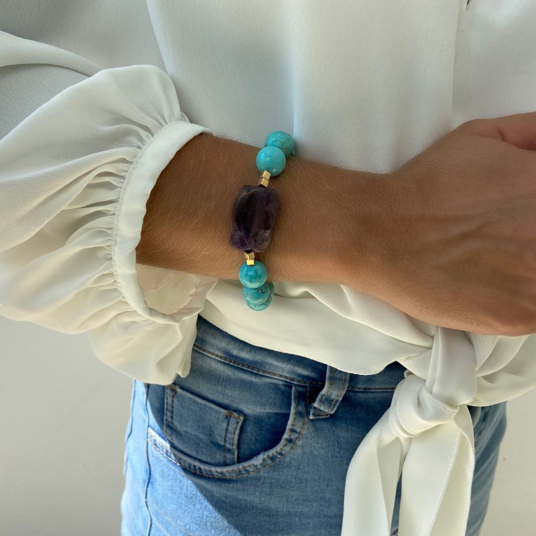Pulseira de pedras Howlita Turquesa e pedra Ametista.